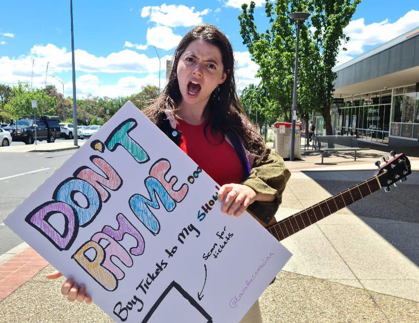 In order to gather an audience, Laura is heeding suggestions on FB such as weeding people’s gardens, moving furniture and standing outside Jamison shops with a sign stating, “don’t give me money, come see my show”.